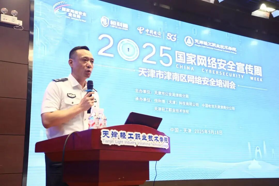 2025年9月18日,由天津市公安局津南分局、中共天津市津南区委网信办主办,中国电信天津津南分公司、恒利德(天津)科技有限公司、天津轻工职业技术学院承办的2025年天津市津南区网络安全培训会在我校顺利召开。9月18日,既是 2025 年国家网络安全宣传周 “法治日” 的重要节点,更是镌刻着历史记忆、呼唤责任与担当的日子。天津市公安局津南分局党委委员、副局长杨光同志、中共天津市津南区委网信办胡宗平副主任、天津轻工职业技术学院网信党支部书记姚策同志、中国电信天津津南分公司副总经理潘娜同志出席此次会议。全区40余家企事业单位、高校及我校教师代表、学生骨干共400余人参加此次会议