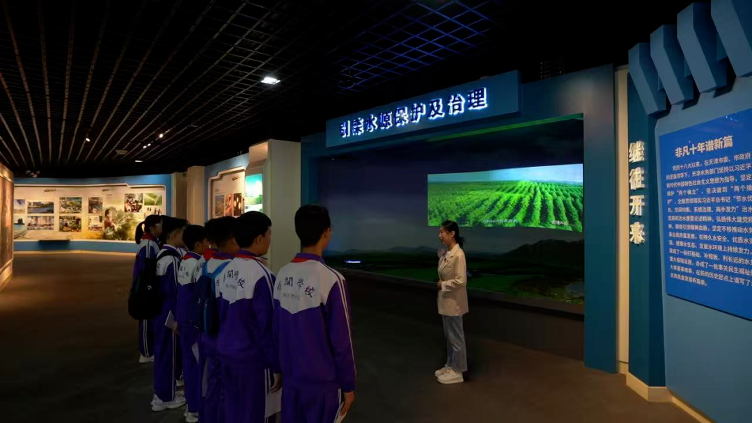 初中学段,天津轻工职业技术学院思政教师李可和南开学校雅润路校区教师张珂宇带领七年级13班学生赴引滦入津展览馆开展实践教学。活动以“解码‘两山理论’的津沽答卷”为主题,通过实地参观、现场讲解与互动研讨,将国家生态文明建设的宏大叙事转化为学生可感知的生动实践。在滦水园,同学们瞻仰了象征城市韧性发展的“跨越”雕塑,走进展馆深入了解引滦入津工程的艰苦卓绝与辉煌成就。从“自来水腌咸菜”的历史困境到军民团结创造的供水奇迹,学生们深刻体会到“绿水青山就是金山银山”的深刻内涵,感悟到引滦精神中蕴含的为民宗旨与奋斗力量。