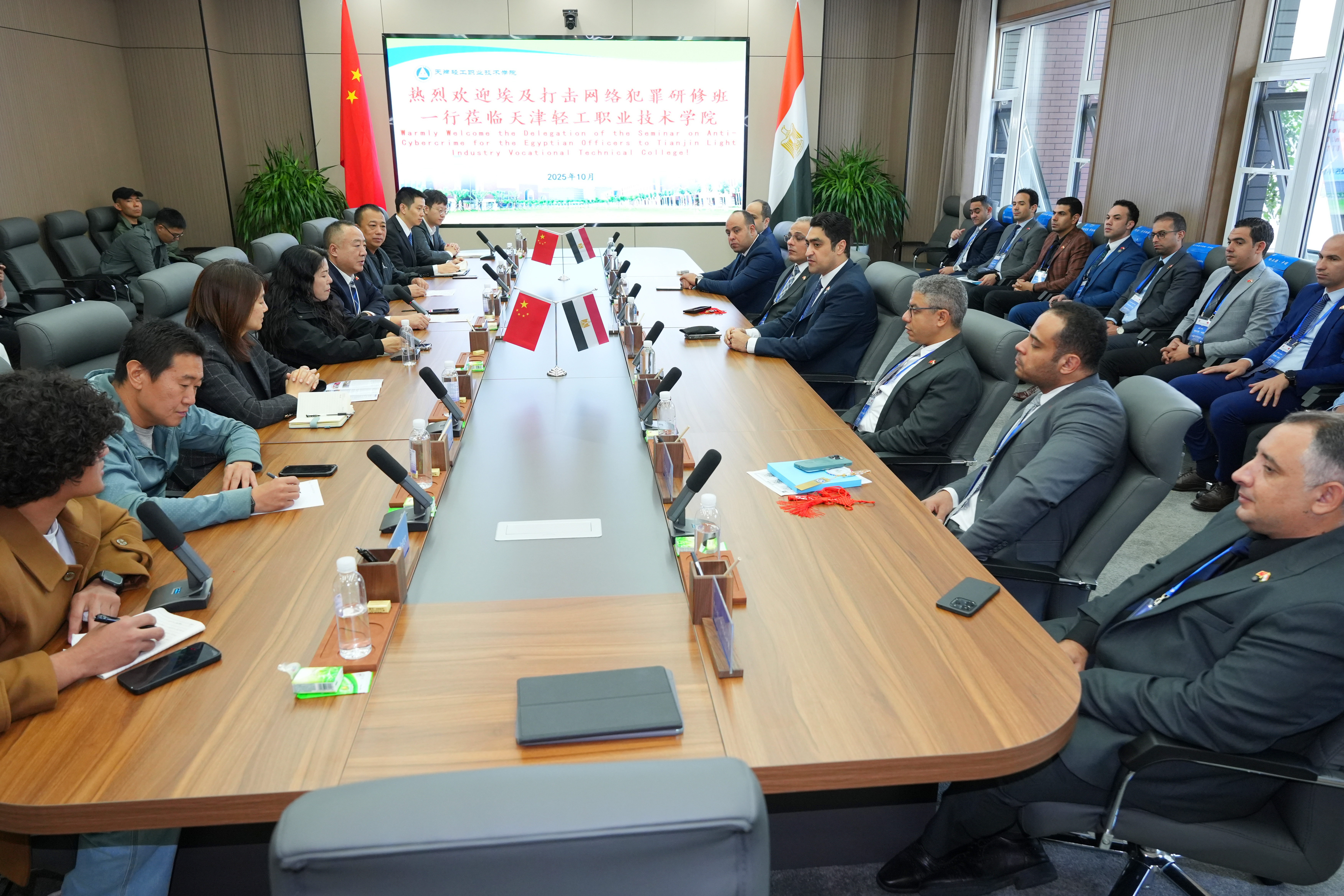 10月22日上午,天津市公安局国际合作总队副队长王汝芃率2025年埃及打击网络犯罪研修班一行15名埃及警官到我院参观交流。我院副院长刘悦凌及国际交流与合作部、校企合作与培训部、安全保卫部相关负责人接待此次来访,埃及留学生小明陪同接待。