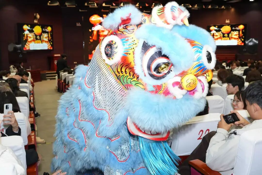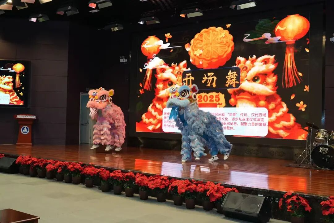 活动在激昂的舞狮表演中拉开帷幕。鼓点铿锵,一对粉蓝双狮跃然台上,灵动腾挪、威武欢腾,瞬间点燃了现场的热烈氛围,暖意弥漫整个会场。
