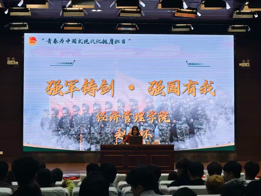 经济管理学院团总支书记赵靖环老师围绕“强军铸剑•强国有我”进行宣讲。她从1927年南昌起义“石破天惊”的第一枪说起,点明这是强军事业的开端。以海军海口舰在亚丁湾护航为例,展现当代强军实践成果。她详细介绍中国军队自1990年来的维和行动,尽显国际担当。最后,她鼓励同学们将专业所学融入强国强军,以青春之力添彩强国事业。